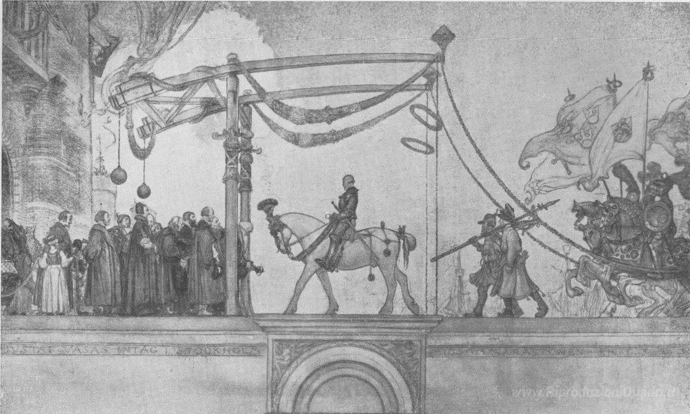 Ti offriamo una riproduzione artigianale su tela dell'opera famosa 'L'ingresso di re Gustavo Vasa di Svezia in Stoccolma, 1523' di Carl Larsson, dal Museo delle Riproduzioni.
