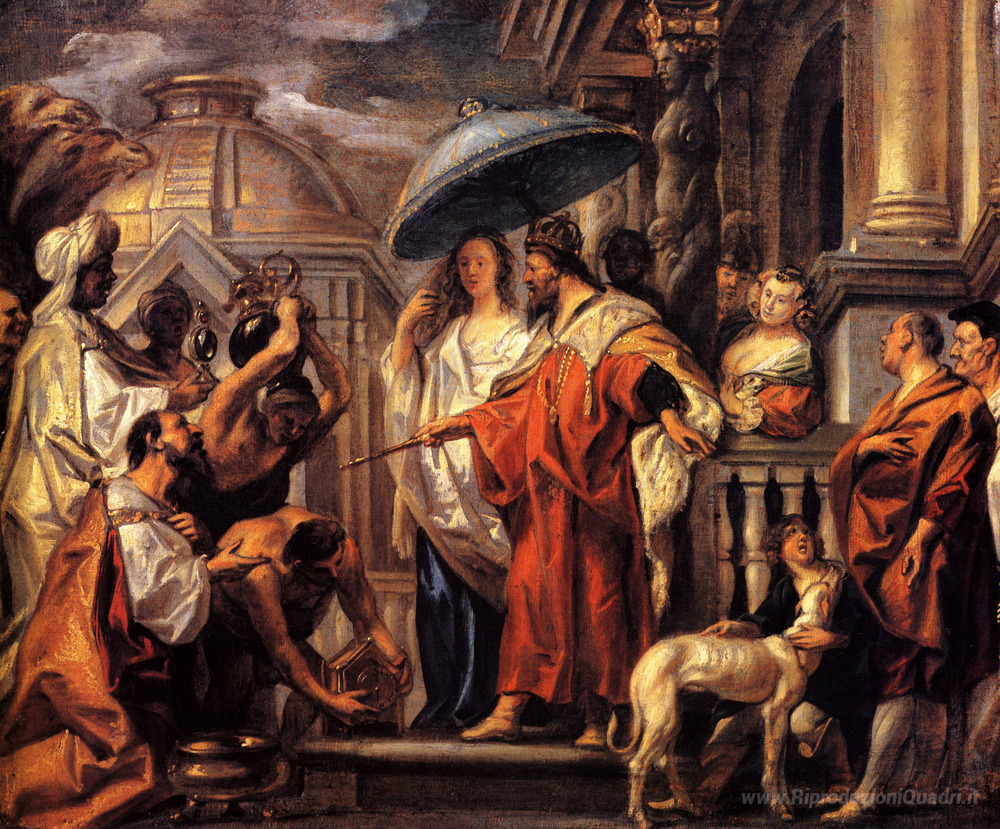 Ti offriamo una riproduzione artigianale su tela dell'opera famosa 'L'omaggio il Califfo Harun al-Rashid a Carlomagno' di Jacob Jordaens, dal Museo delle Riproduzioni.