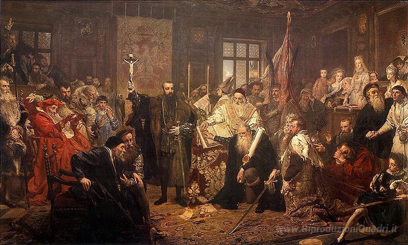Ti offriamo una riproduzione artigianale su tela dell'opera famosa 'L'Unione di Lublino' di Jan Matejko, dal Museo delle Riproduzioni.