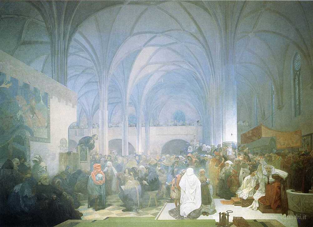 Ti offriamo una riproduzione artigianale su tela dell'opera famosa 'Maestro Jan Hus predicazione nella Cappella di Betlemme' di Alphonse Mucha, dal Museo delle Riproduzioni.
