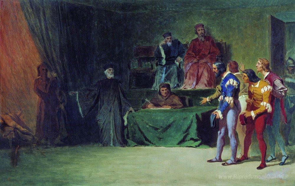 Ti offriamo una riproduzione artigianale su tela dell'opera famosa 'Mosaicisti dinanzi al giudice tre a Venezia' di Fyodor Bronnikov, dal Museo delle Riproduzioni.