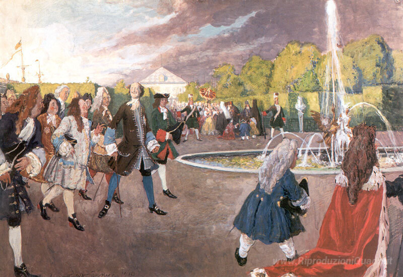 Ti offriamo una riproduzione artigianale su tela dell'opera famosa 'Peter Ho una passeggiata nel giardino estivo' di Alexandre Benois, dal Museo delle Riproduzioni.