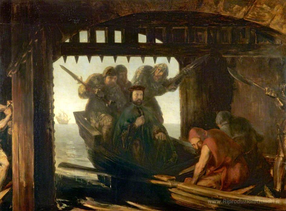 Ti offriamo una riproduzione artigianale su tela dell'opera famosa 'Porta del Traditore' di David Scott, dal Museo delle Riproduzioni.