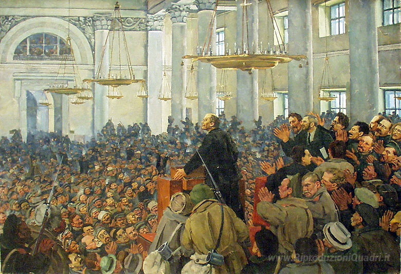 Ti offriamo una riproduzione artigianale su tela dell'opera famosa 'Prima apparizione di Lenin in una riunione a Smolny, il Soviet d' di Konstantin Yuon, dal Museo delle Riproduzioni.