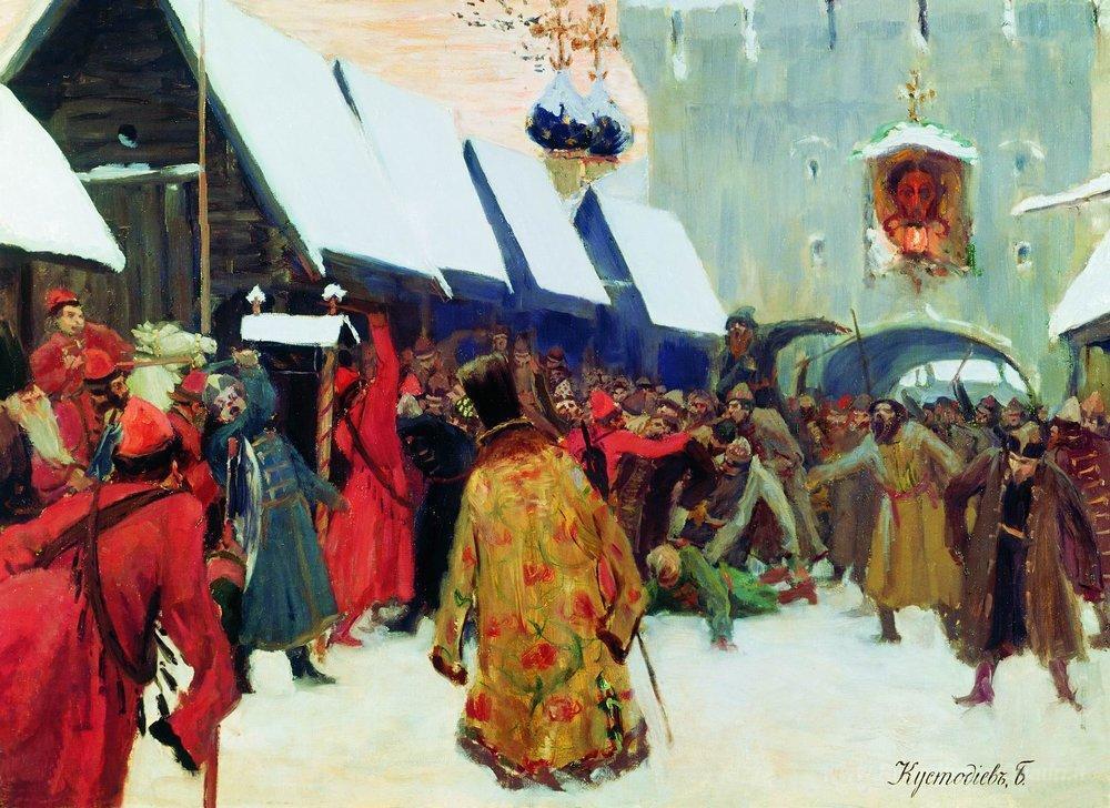 Ti offriamo una riproduzione artigianale su tela dell'opera famosa 'Rivolta contro i boiardi nella vecchia Russia' di Boris Kustodiev, dal Museo delle Riproduzioni.