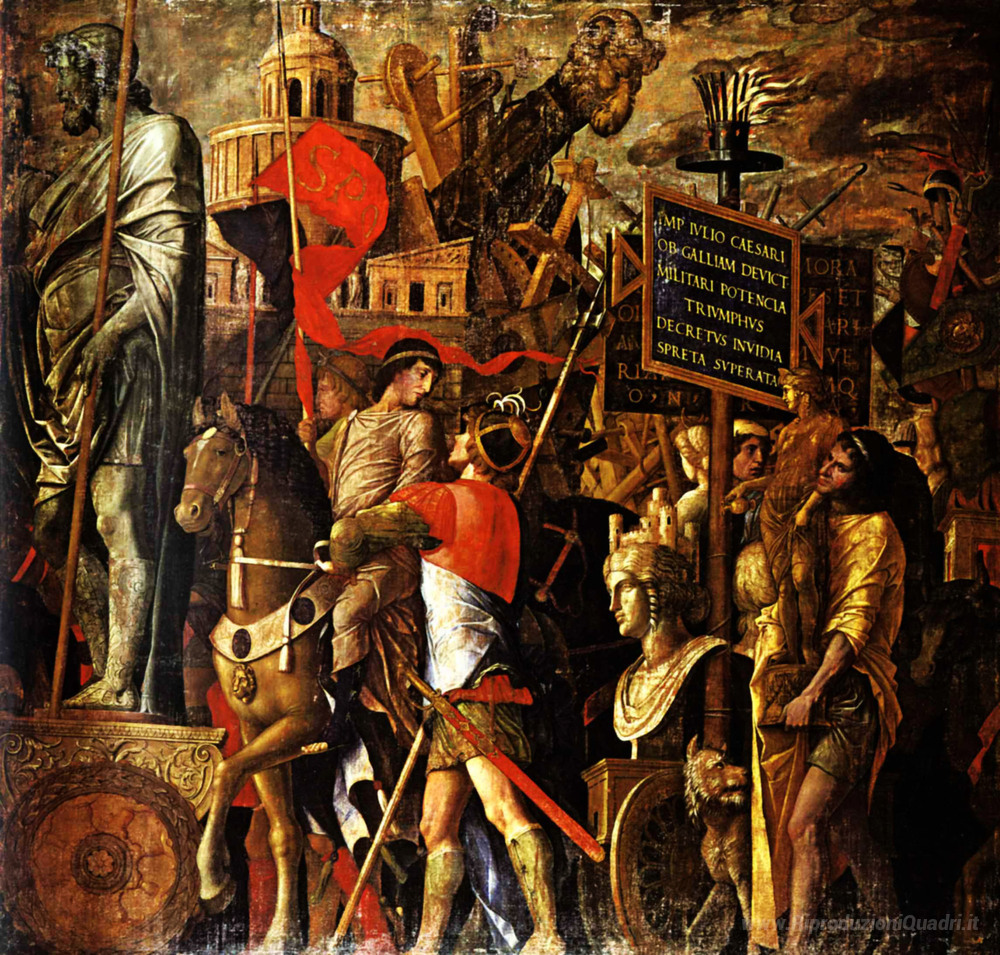 Ti offriamo una riproduzione artigianale su tela dell'opera famosa 'Statue catturate e macchine d'assedio, la rappresentazione di un' di Andrea Mantegna, dal Museo delle Riproduzioni.
