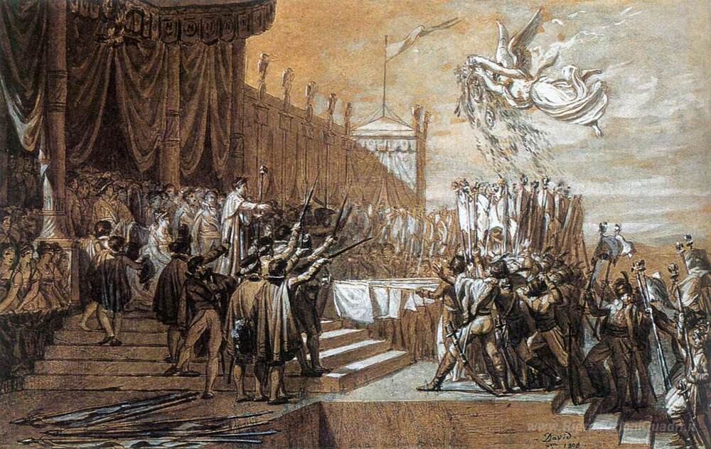 Ti offriamo una riproduzione artigianale su tela dell'opera famosa 'Studio per la distribuzione degli Standard Aquila' di Jacques-Louis David, dal Museo delle Riproduzioni.