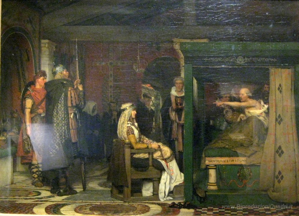 Ti offriamo una riproduzione artigianale su tela dell'opera famosa 'Visita Fredegunda Pretestato sul letto di morte' di Sir Lawrence Alma-Tadema, dal Museo delle Riproduzioni.