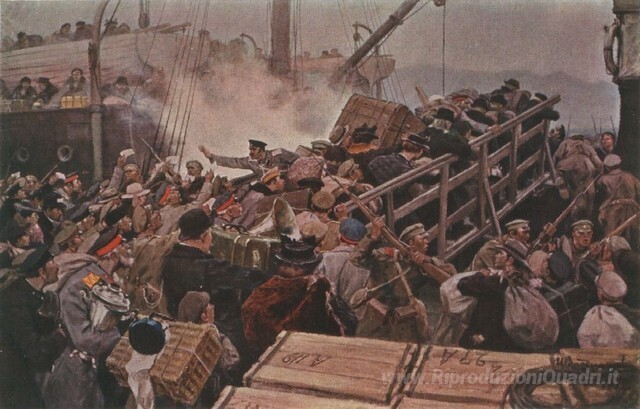 Ti offriamo una riproduzione artigianale su tela dell'opera famosa 'Volo della borghesia da Novorossiysk nel 1920' di Ivan Vladimirov, dal Museo delle Riproduzioni.