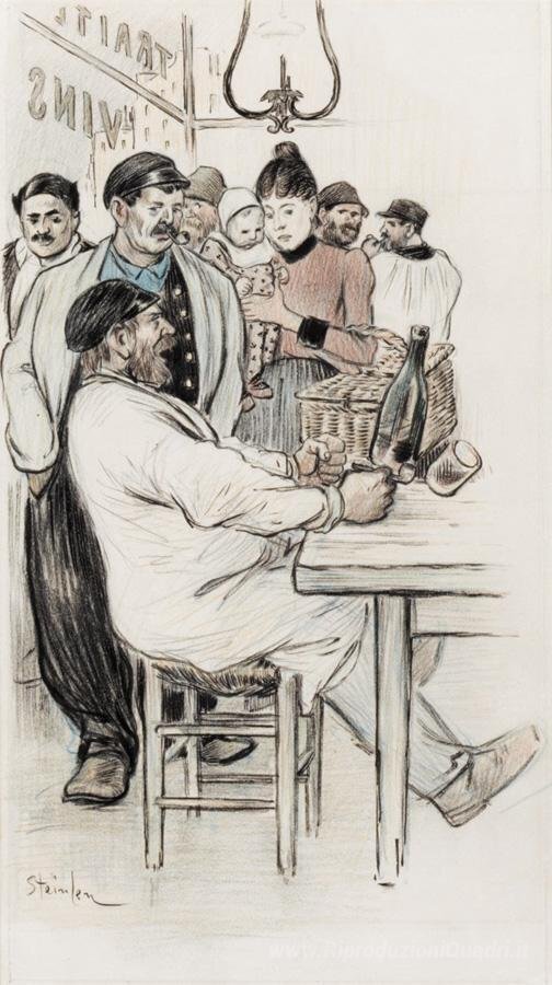 Ti offriamo una riproduzione artigianale su tela dell'opera famosa 'Au Bistrot' di Theophile Steinlen, dal Museo delle Riproduzioni.
