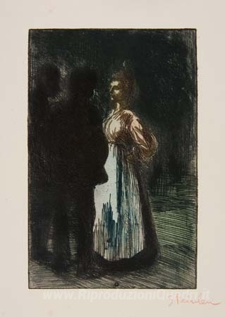 Ti offriamo una riproduzione artigianale su tela dell'opera famosa 'Colloque Nocturne' di Theophile Steinlen, dal Museo delle Riproduzioni.