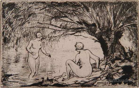Benvenuti nella nostra raffinata collezione di dipinti a olio italiani, dove ogni opera racconta una storia unica, ricca di emozione e passione artistica. Oggi, vi presentiamo un'opera straordinaria: Deux Baigneuses dell'artista Theophile Steinlen. Questo capolavoro cattura l'essenza di un momento di tranquillità, rappresentando due donne al bagno in un'atmosfera intima e contemplativa.