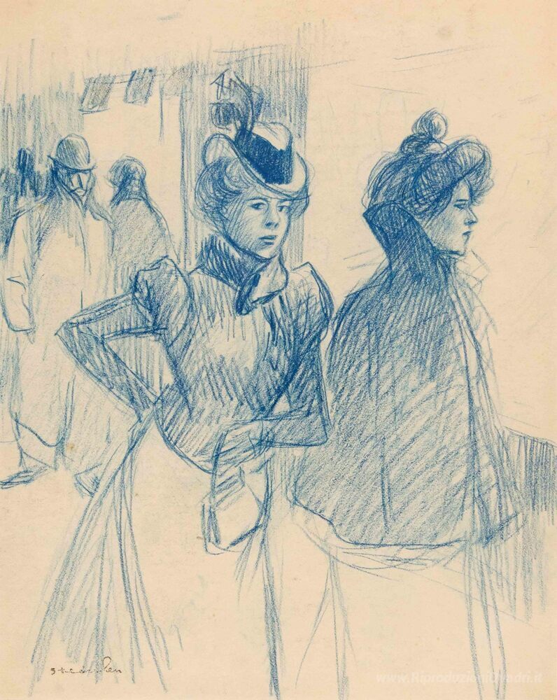 Ti offriamo una riproduzione artigianale su tela dell'opera famosa 'Due donne eleganti' di Theophile Steinlen, dal Museo delle Riproduzioni.