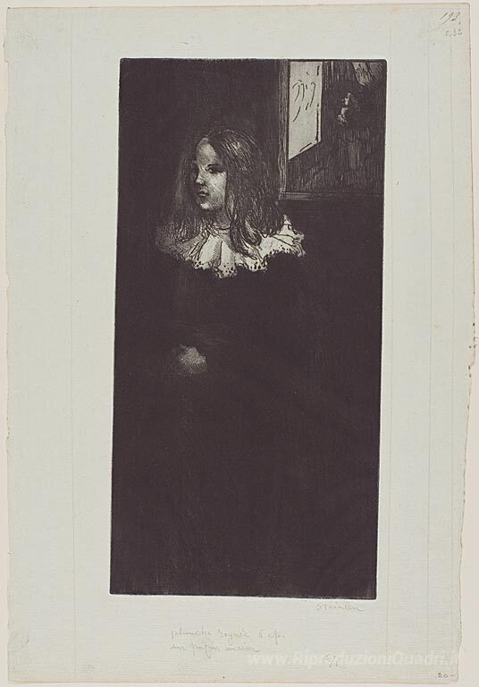 Ti offriamo una riproduzione artigianale su tela dell'opera famosa 'Fillette Au Col Blanc' di Theophile Steinlen, dal Museo delle Riproduzioni.