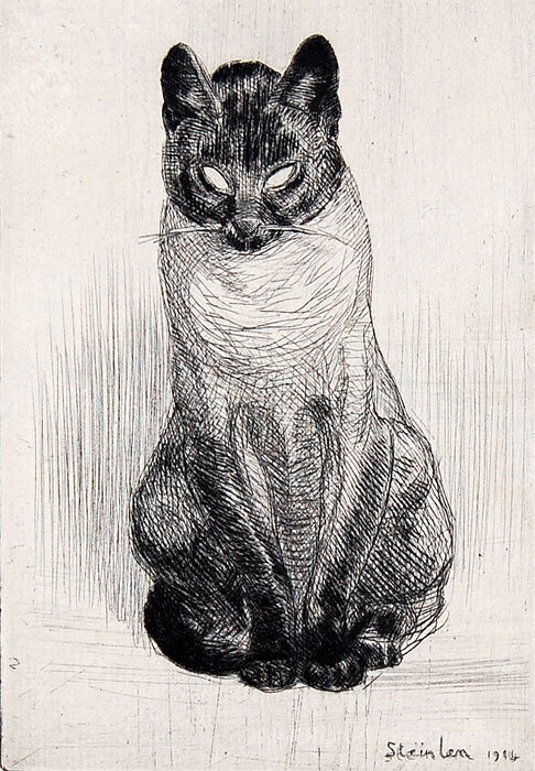 Ti offriamo una riproduzione artigianale su tela dell'opera famosa 'Gatto siamese Seduti' di Theophile Steinlen, dal Museo delle Riproduzioni.