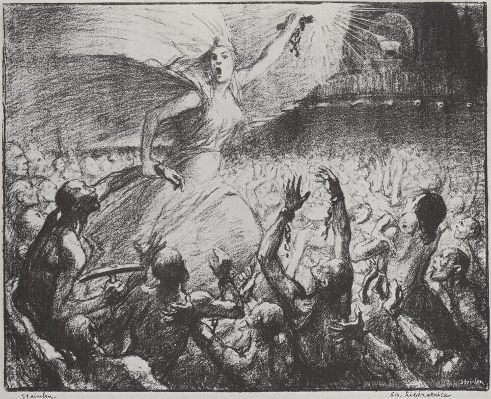 Ti offriamo una riproduzione artigianale su tela dell'opera famosa 'La Liberatrice' di Theophile Steinlen, dal Museo delle Riproduzioni.