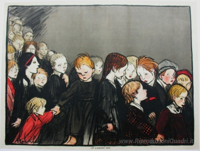 Ti offriamo una riproduzione artigianale su tela dell'opera famosa 'La Maternelle' di Theophile Steinlen, dal Museo delle Riproduzioni.
