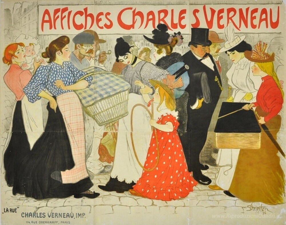 Ti offriamo una riproduzione artigianale su tela dell'opera famosa 'La Rue' di Theophile Steinlen, dal Museo delle Riproduzioni.