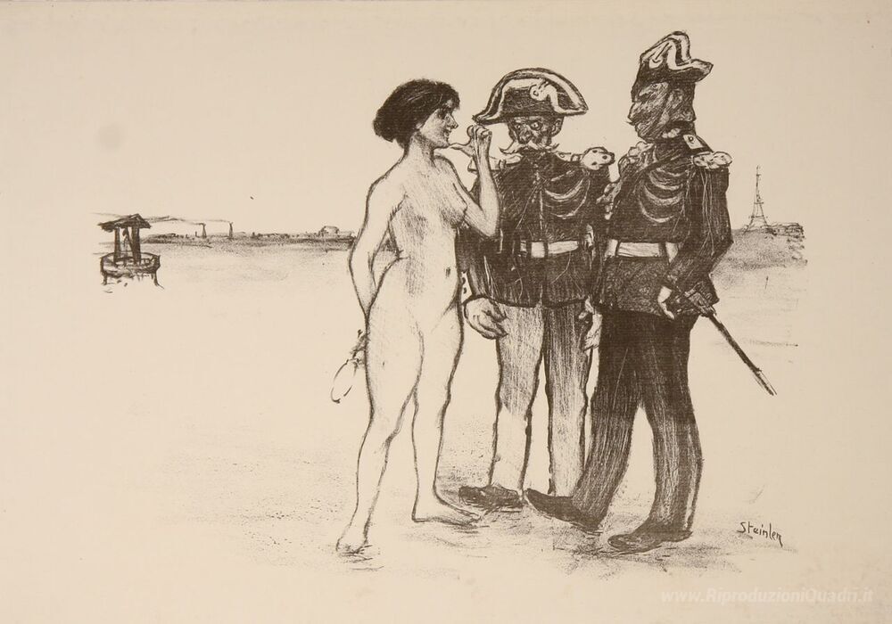 Scoprite l'incanto del dipinto La Verite Et Les Deux Gendarmi realizzato dal maestro francese Theophile Steinlen. Questo straordinario artista, attivo tra la fine del XIX e gli inizi del XX secolo, è noto per la sua abilità nel catturare la vita quotidiana parigina attraverso una lente d'emozione e sensibilità. Le sue opere, spesso caratterizzate da una forte carica espressiva, mettono in luce la complessità delle relazioni umane e delle dinamiche sociali.
