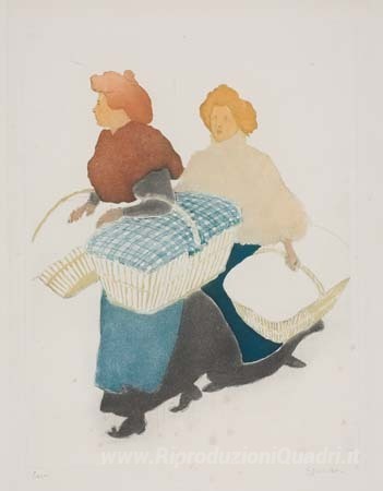 Ti offriamo una riproduzione artigianale su tela dell'opera famosa 'Lavandaie stanno portando biancheria' di Theophile Steinlen, dal Museo delle Riproduzioni.