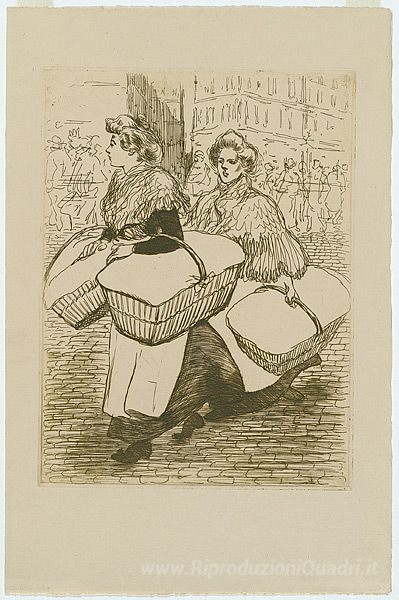 Ti offriamo una riproduzione artigianale su tela dell'opera famosa 'Lavandaie stanno portando biancheria' di Theophile Steinlen, dal Museo delle Riproduzioni.