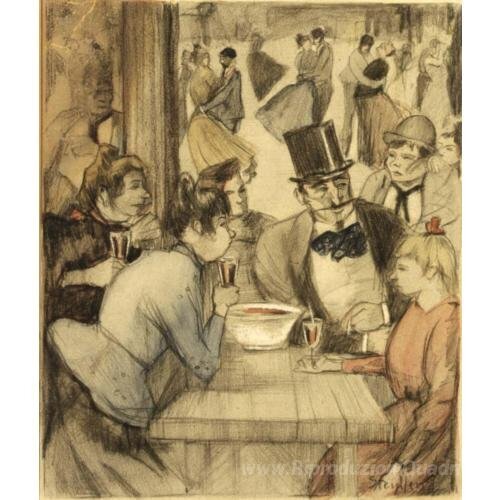 Ti offriamo una riproduzione artigianale su tela dell'opera famosa 'Le persone al Cafe' di Theophile Steinlen, dal Museo delle Riproduzioni.