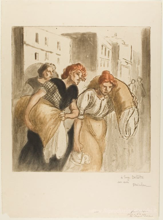 Ti offriamo una riproduzione artigianale su tela dell'opera famosa 'Le Retour du Lavoir' di Theophile Steinlen, dal Museo delle Riproduzioni.