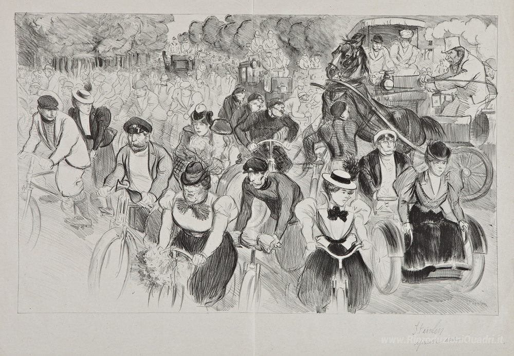 Ti offriamo una riproduzione artigianale su tela dell'opera famosa 'Les Cyclistes' di Theophile Steinlen, dal Museo delle Riproduzioni.
