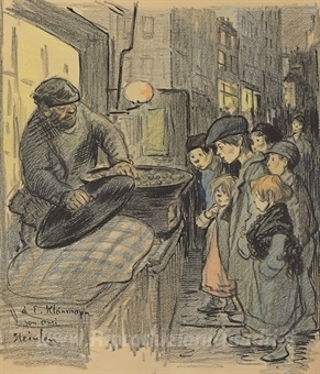Ti offriamo una riproduzione artigianale su tela dell'opera famosa 'Marchand de Marrons' di Theophile Steinlen, dal Museo delle Riproduzioni.