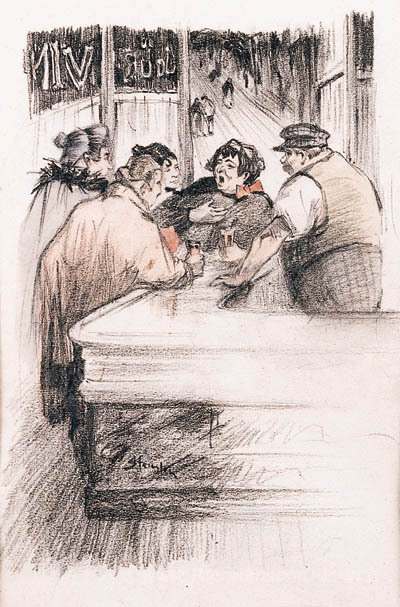 Ti offriamo una riproduzione artigianale su tela dell'opera famosa 'Souper du Mac' di Theophile Steinlen, dal Museo delle Riproduzioni.