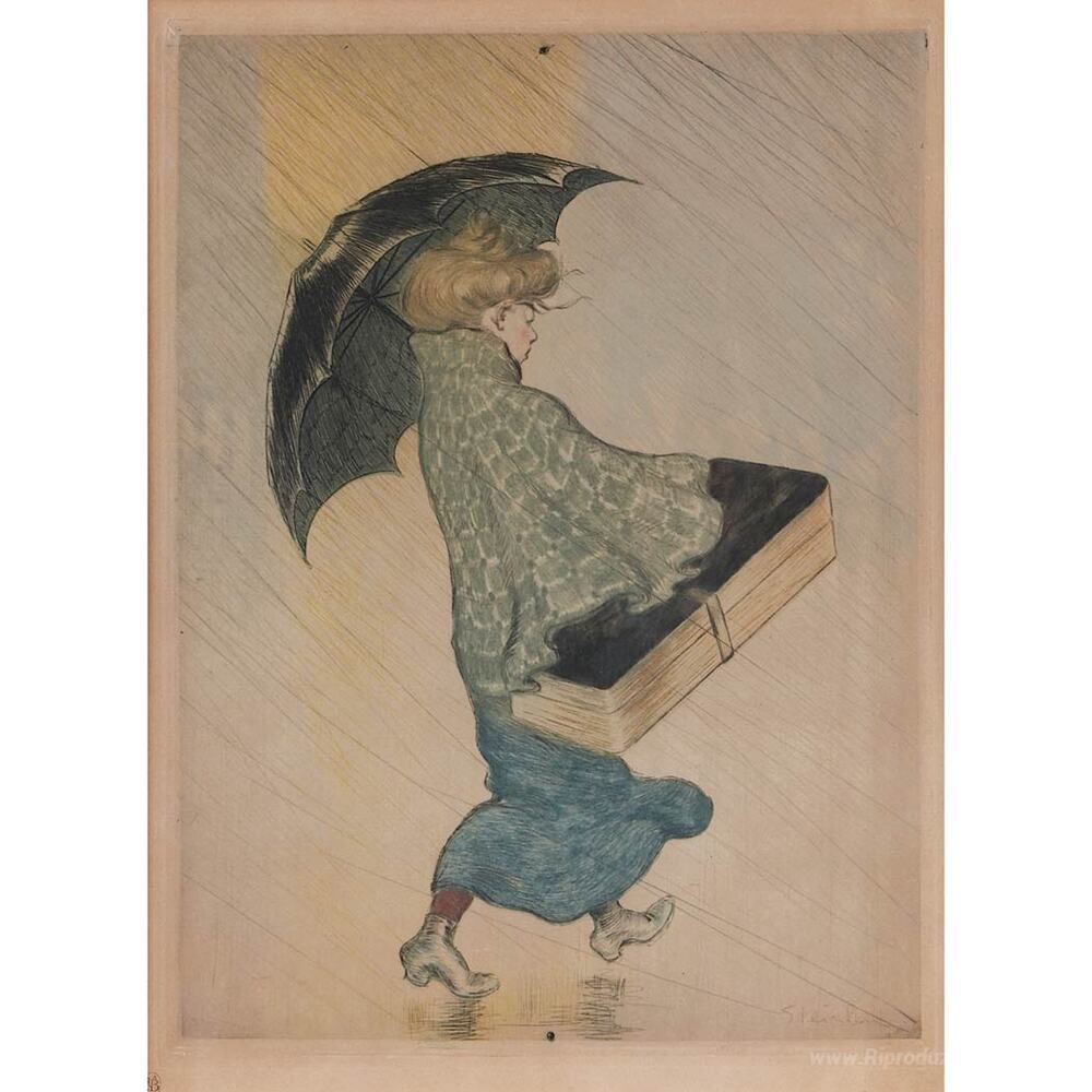 Ti offriamo una riproduzione artigianale su tela dell'opera famosa 'Trottin Sous La Pluie' di Theophile Steinlen, dal Museo delle Riproduzioni.