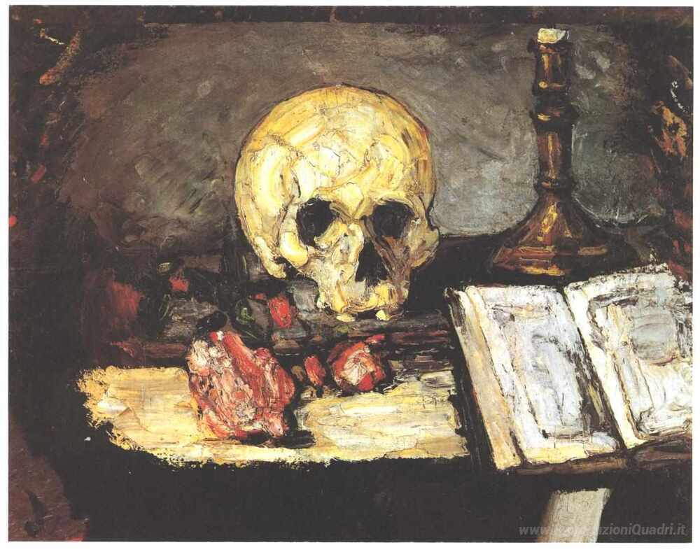 Ti offriamo una riproduzione artigianale su tela dell'opera famosa 'Natura morta con teschio, candela e libro' di Paul Cezanne, dal Museo delle Riproduzioni.
