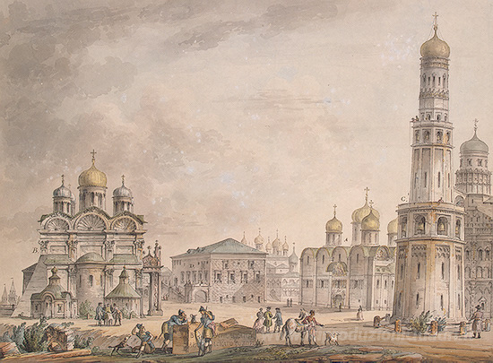 Ti offriamo una riproduzione artigianale su tela dell'opera famosa 'Cattedrale Piazza del Cremlino di Mosca' di Giacomo Quarenghi, dal Museo delle Riproduzioni.