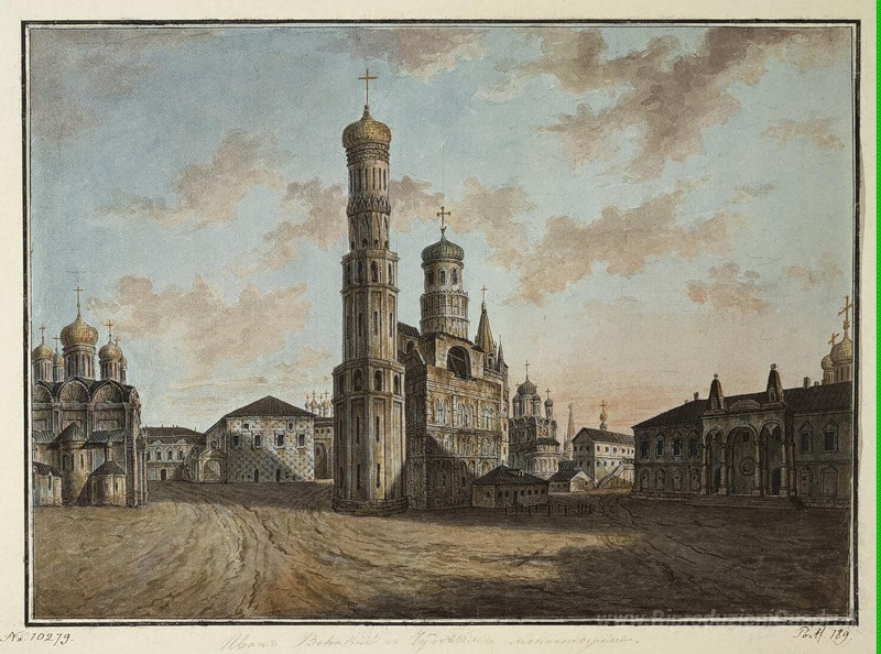 Ti offriamo una riproduzione artigianale su tela dell'opera famosa 'Ivan il Grande Campanile e Monastero Chudov al Cremlino' di Fyodor Alekseyev, dal Museo delle Riproduzioni.