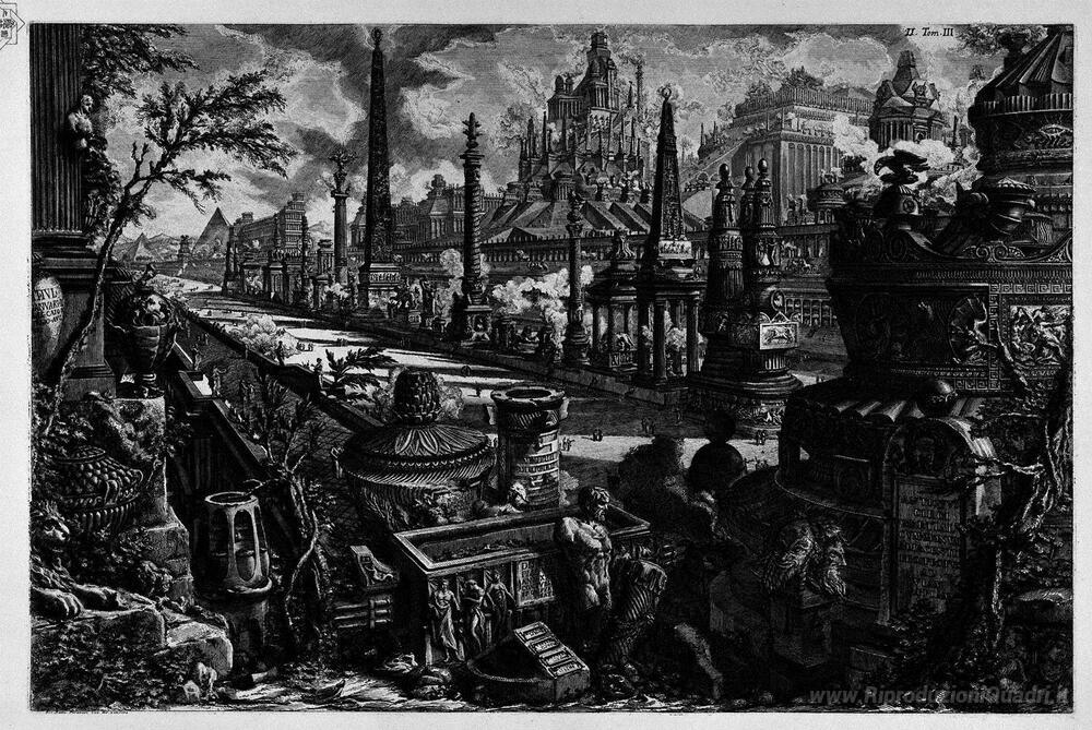 Ti offriamo una riproduzione artigianale su tela dell'opera famosa 'Le antichità romane, t. 3, Plate II. Seguendo la tabella di cui ' di Giovanni Battista Piranesi, dal Museo delle Riproduzioni.
