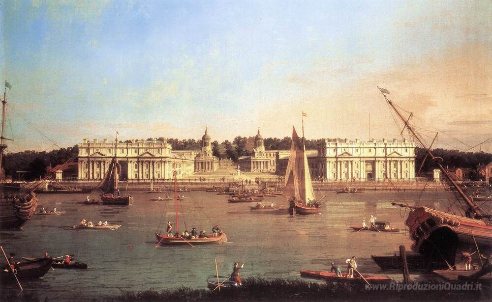 Ti offriamo una riproduzione artigianale su tela dell'opera famosa 'Londra: Greenwich Hospital da riva nord del Tamigi' di Canaletto, dal Museo delle Riproduzioni.