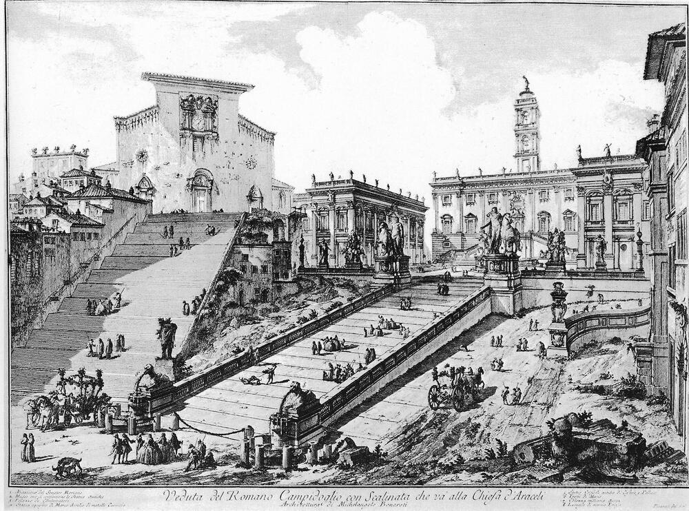 Ti offriamo una riproduzione artigianale su tela dell'opera famosa 'Vedute di Roma' di Giovanni Battista Piranesi, dal Museo delle Riproduzioni.