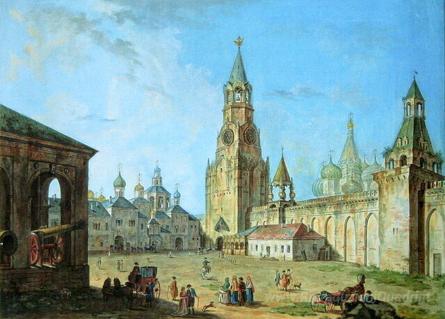 Ti offriamo una riproduzione artigianale su tela dell'opera famosa 'Vista dal Cremlino Spassky Porta' di Fyodor Alekseyev, dal Museo delle Riproduzioni.