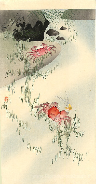 Ti offriamo una riproduzione artigianale su tela dell'opera famosa 'Crabs' di Ohara Koson, dal Museo delle Riproduzioni.