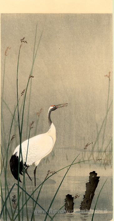 Ti offriamo una riproduzione artigianale su tela dell'opera famosa 'Crane in acqua di piccole' di Ohara Koson, dal Museo delle Riproduzioni.