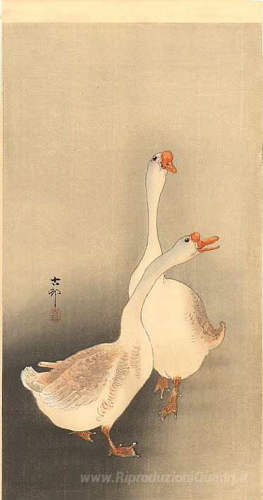 Ti offriamo una riproduzione artigianale su tela dell'opera famosa 'Due oche bianche' di Ohara Koson, dal Museo delle Riproduzioni.