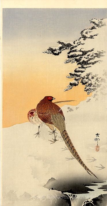 Ti offriamo una riproduzione artigianale su tela dell'opera famosa 'Fagiani sulla neve' di Ohara Koson, dal Museo delle Riproduzioni.