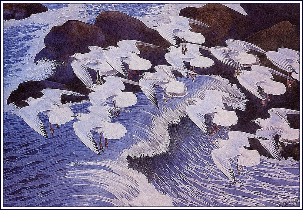Ti offriamo una riproduzione artigianale su tela dell'opera famosa 'Gabbiani' di Charles Tunnicliffe, dal Museo delle Riproduzioni.