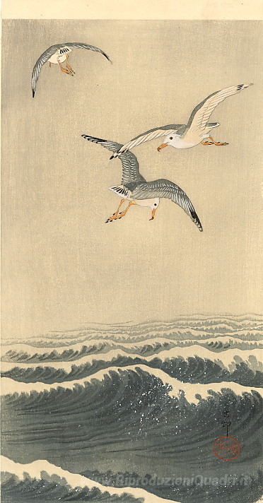Ti offriamo una riproduzione artigianale su tela dell'opera famosa 'Gabbiani sopra le onde' di Ohara Koson, dal Museo delle Riproduzioni.