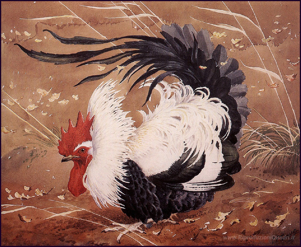 Ti offriamo una riproduzione artigianale su tela dell'opera famosa 'Galletto Nel Vento' di Charles Tunnicliffe, dal Museo delle Riproduzioni.