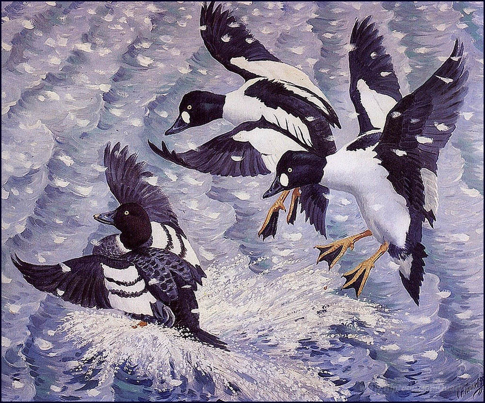 Ti offriamo una riproduzione artigianale su tela dell'opera famosa 'Goldeneye in una tempesta di neve' di Charles Tunnicliffe, dal Museo delle Riproduzioni.