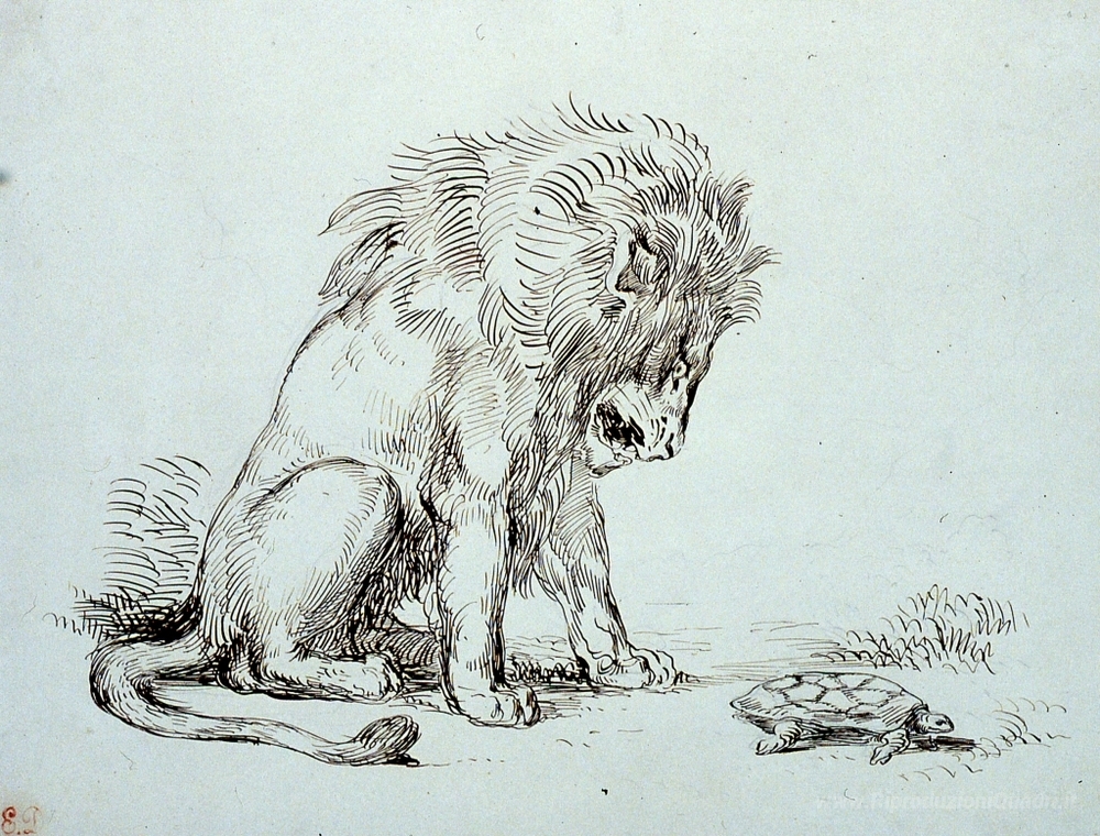 Ti offriamo una riproduzione artigianale su tela dell'opera famosa 'Leone e Tortoise' di Eugene Delacroix, dal Museo delle Riproduzioni.