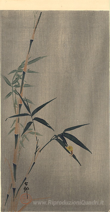 Ti offriamo una riproduzione artigianale su tela dell'opera famosa 'Lumaca sulla foglia di bambù' di Ohara Koson, dal Museo delle Riproduzioni.