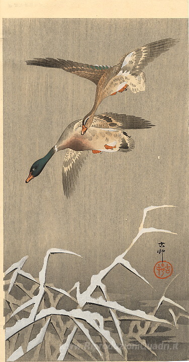 Ti offriamo una riproduzione artigianale su tela dell'opera famosa 'Mallards' di Ohara Koson, dal Museo delle Riproduzioni.