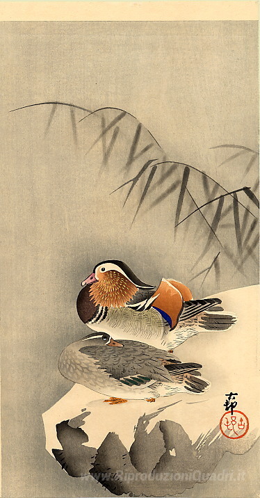 Ti offriamo una riproduzione artigianale su tela dell'opera famosa 'Mandarin Ducks in neve' di Ohara Koson, dal Museo delle Riproduzioni.